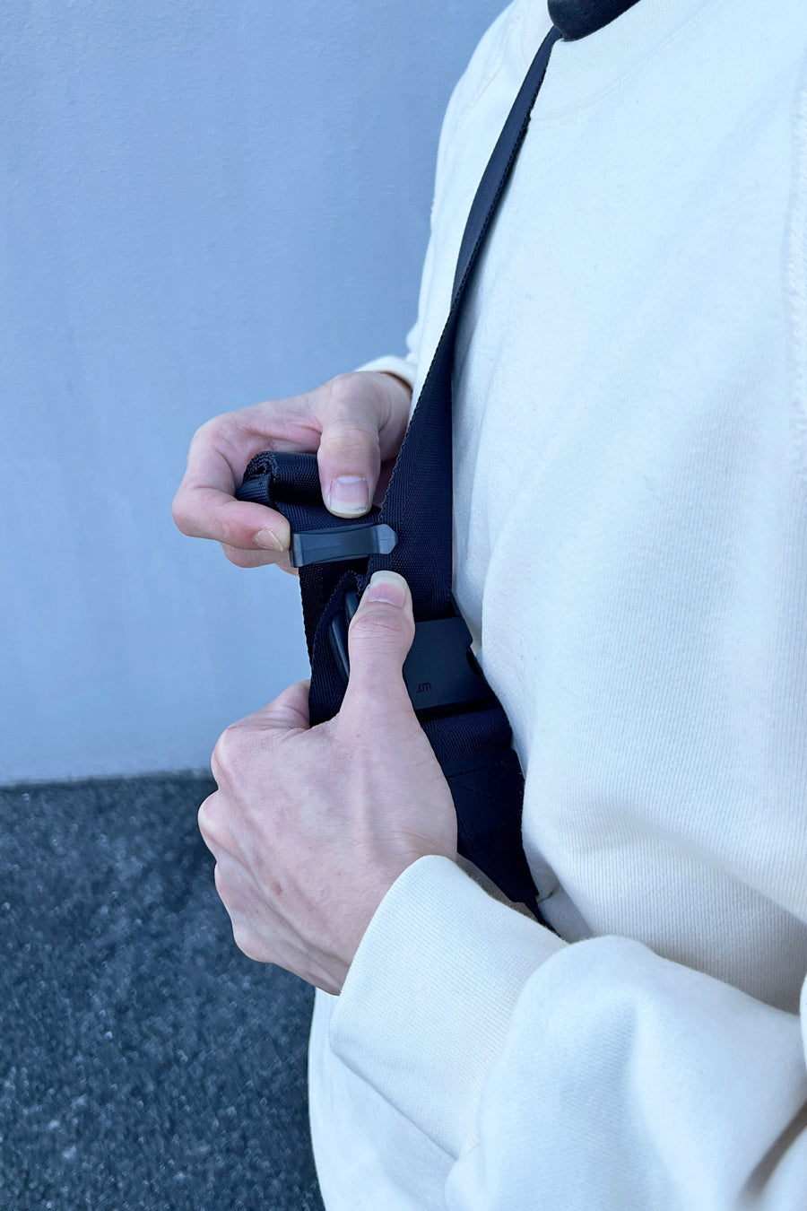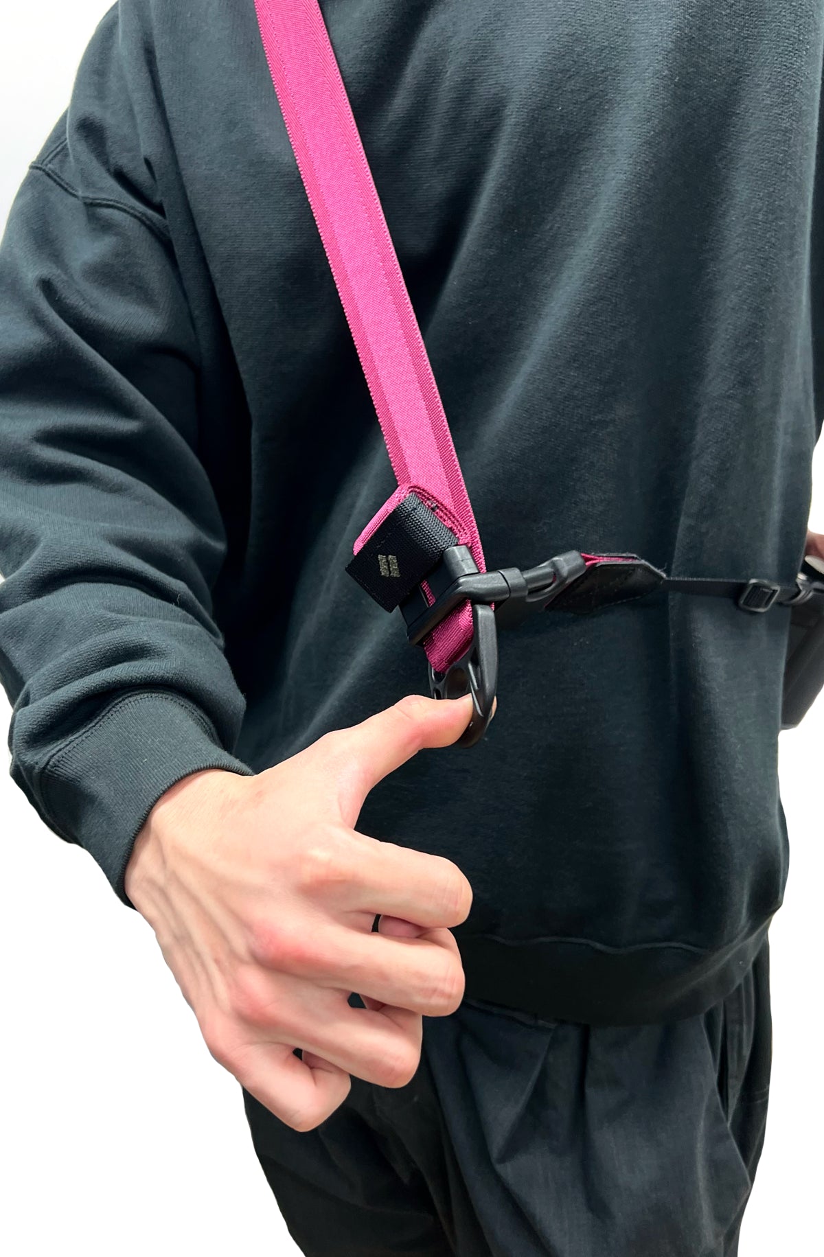 メッセンジャーバッグのバックル機構を採用。片手で簡単に長さ調節が可能。状況に応じてベストな長さに伸縮できます。