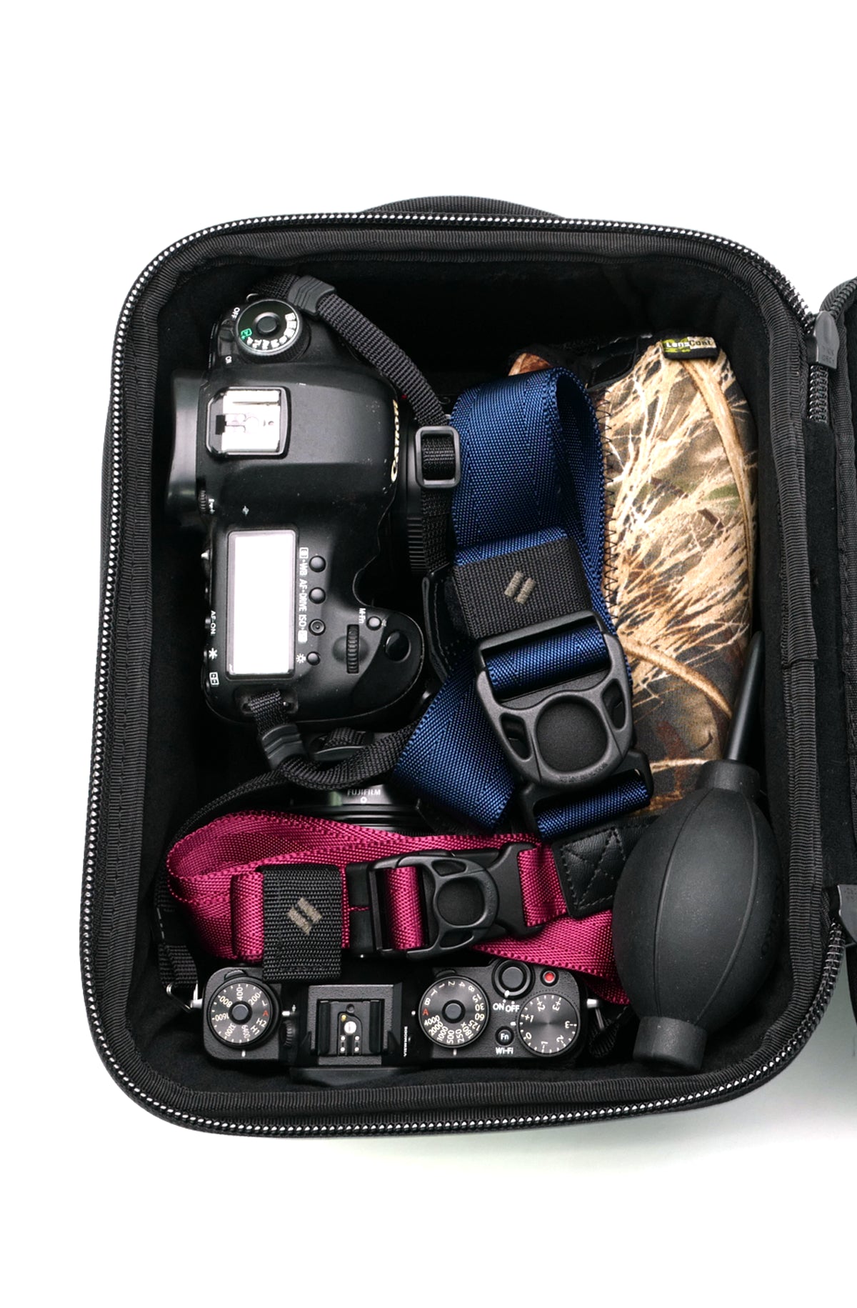 ストラップ本体は柔らかくしなやかなナイロン素材。自由に形を変えることができるので、撮影終了後コンパクトにまとめてカメラバッグへ収納。ストレスなくカメラの出し入れが可能です。